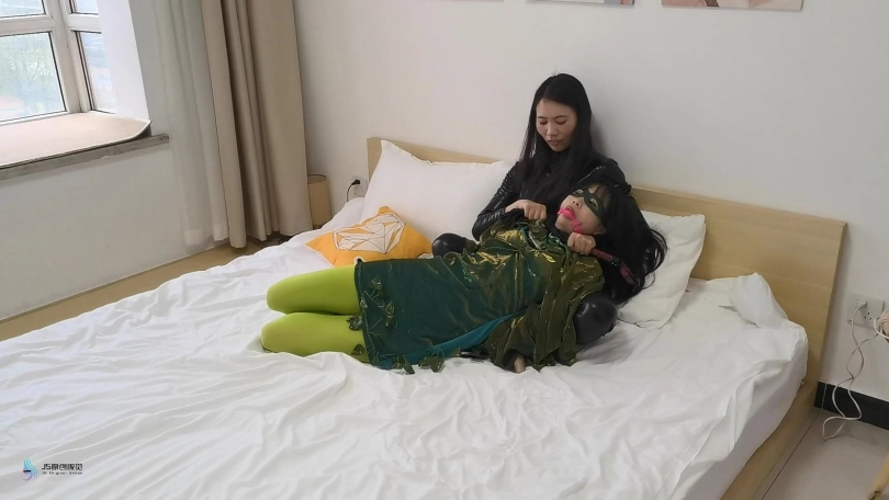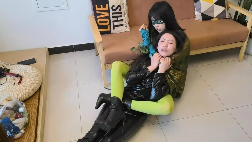 毒腾女找到暗夜女侠,两人一言不合亏就开始打了起来。毒腾女趁机从后面抱住暗夜女侠,双腿紧紧的扣住对反过的身体,同时臂对桉叶女侠进行锁喉。女侠不断挣扎,但很快便缺氧晕了过去。女侠再次醒来时候,发现自己手脚被镣铐束缚着。她想挣脱,但铁链很牢固。过了一会毒腾女走了过来,用她穿着靴子的脚踩住女侠的脖子,毒腾女此时只有一只脚着地,女侠看准时机,抓住她的脚用力一抬,女腾女失去重心摔在地上晕了过去。当她再次醒来时候,她发现自己被铁链镣铐束缚成驷马的姿势趴在床上,嘴巴里还塞着口球。此时女侠走进房间,用皮鞭抽打着毒腾女的身体。打累的女侠脱掉自己的靴子来到床上,她捧起毒腾女的脚丫,抚摸并亲吻着。突然女侠用力掰着对方的脚,毒腾女痛苦的挣扎着。但很快她的脖子被女侠用片子勒着,慢慢的睡了过去。。。