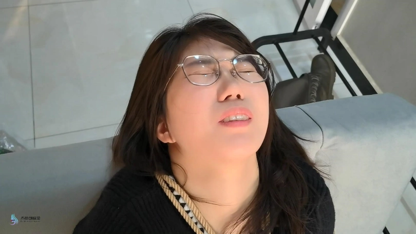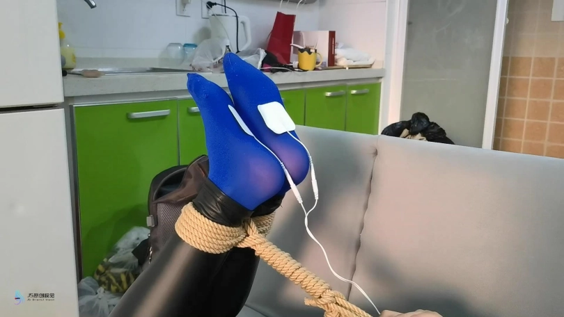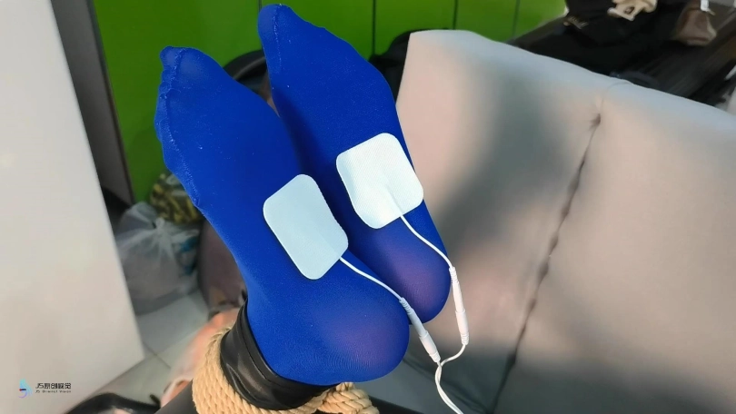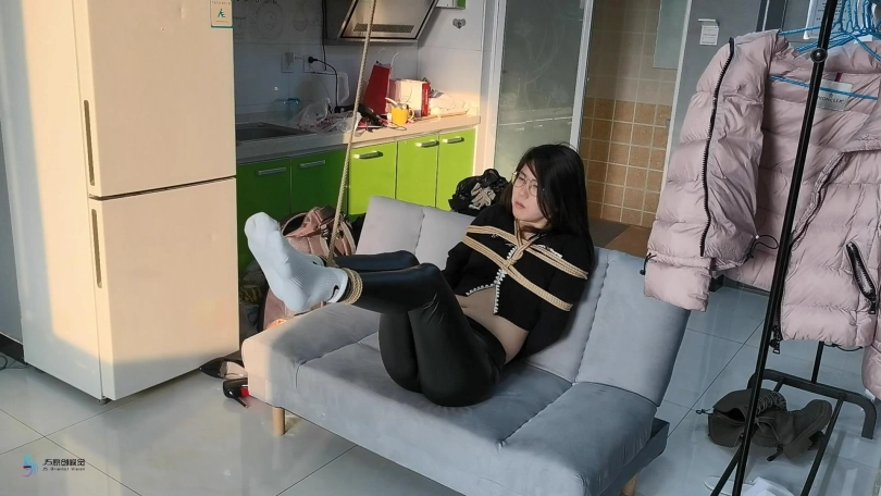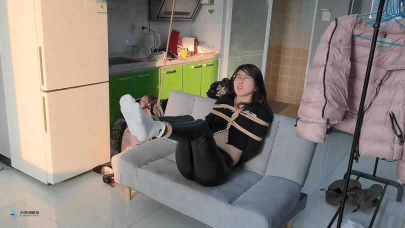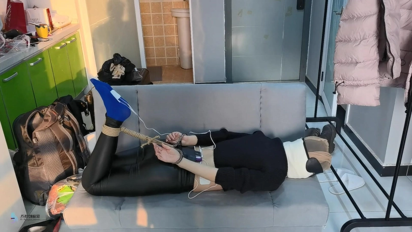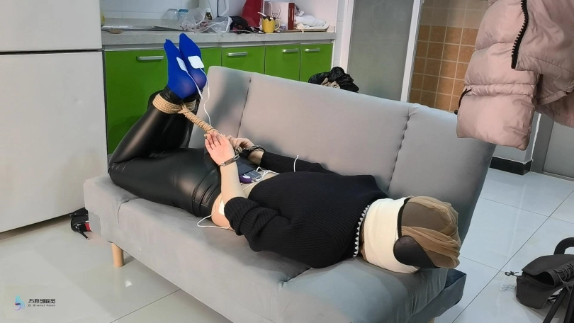 当画面再次两期时,芷若已经被驷马捆绑趴在沙发上。她的头上被套着一天连裤袜,外面缠绕着绷带,眼睛被蒙着。她只能发出微弱的呜呜声,听声音就知道,嘴巴里一定也被塞着东西。她的要不和脚底都被贴着电击片,下面敏感处也被放进了TD刺激着,不断的消耗着她的体能。相信这一定是芷若最难忘的暑假。。。