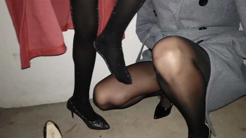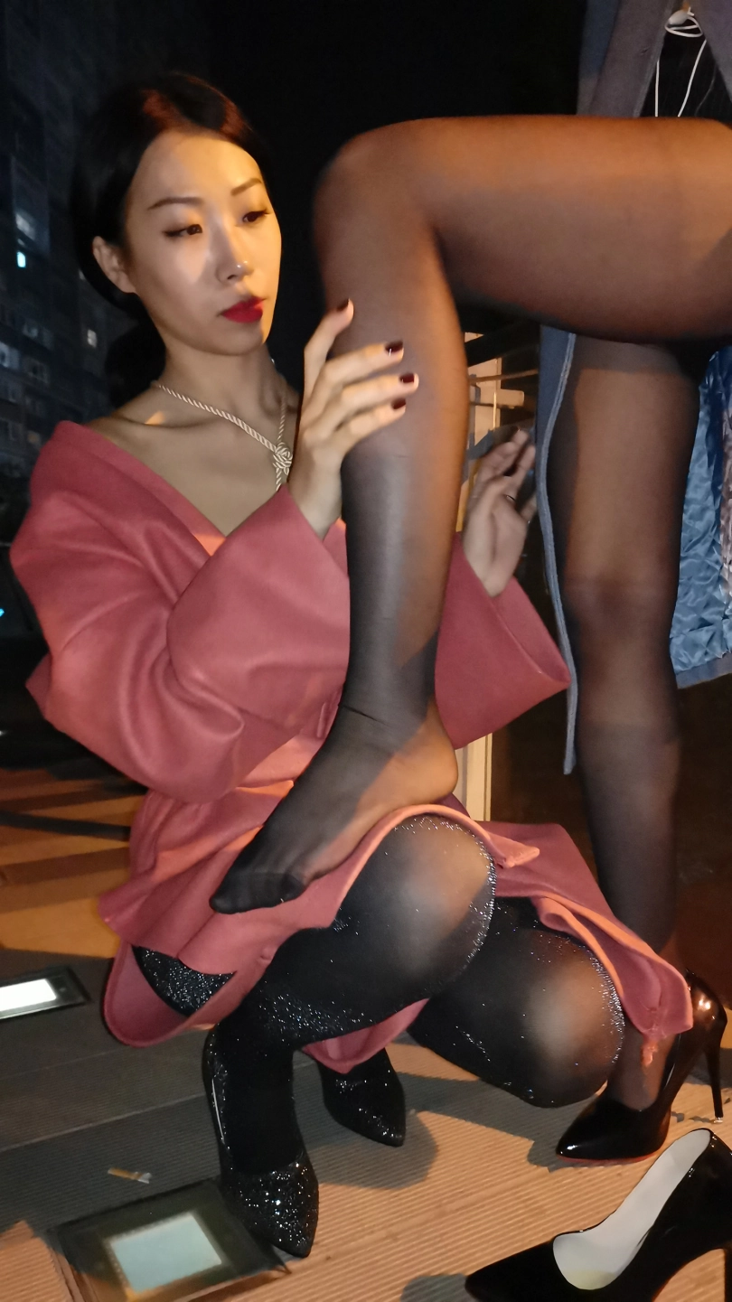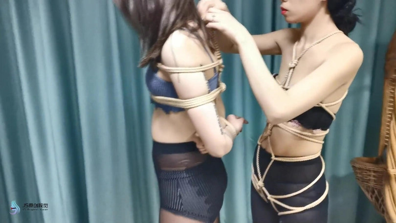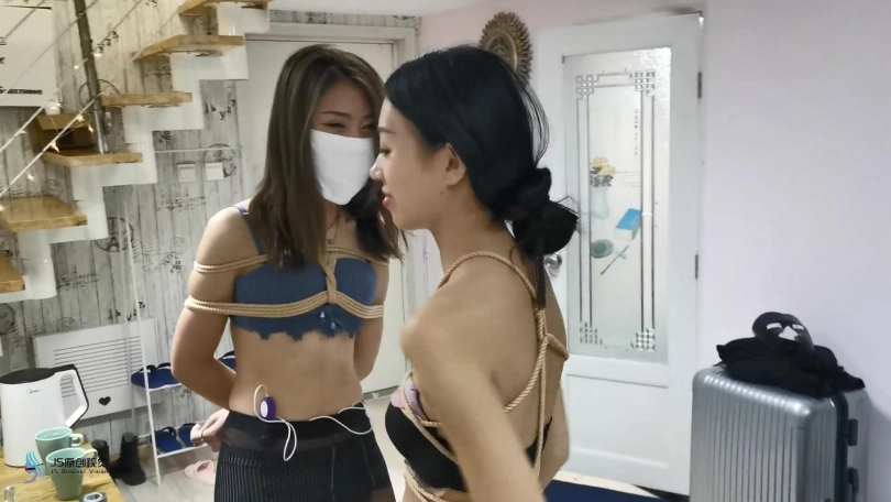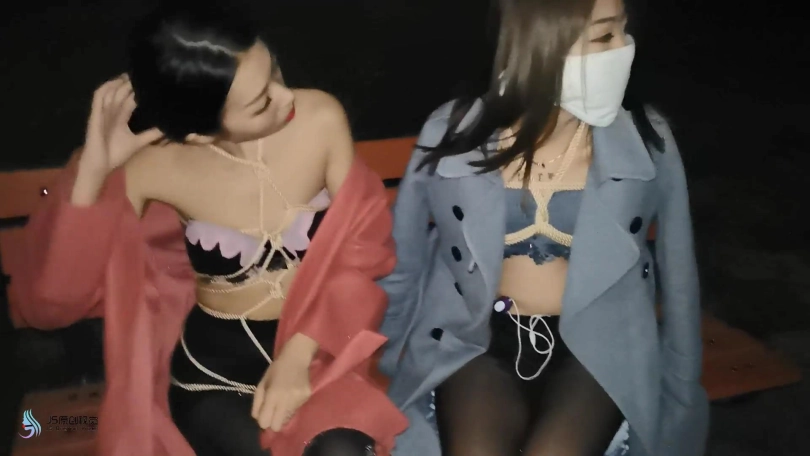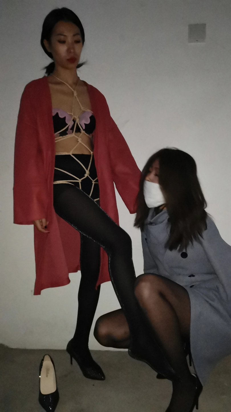 艾诺身上绑着龟甲,然后她把瑾萱也捆绑起来。瑾萱的嘴里被艾诺塞进了一条丝袜并用胶带封住。再戴上口罩避免别别人看到。艾诺将一个双头的ZD蛋放进瑾萱的敏感部位并打开开关刺激着瑾萱。两人只穿着内衣和连裤袜高跟鞋,外面披着外套出门。电梯里的哥们好像看到了艾诺衣服里的绳子,一直不停的看着,旁边的瑾萱不好意的将头转向一边笑着。来到公园的长椅上,两位美女解开衣服,艾诺挑逗着瑾萱的胸部和下面,并亲吻瑾萱。走到天桥上比较亮的地方,艾诺蹲下身子不断的抚摸着瑾萱的下面并亲吻着她的腿。最后来到楼梯间,瑾萱蹲在地上,艾诺脱下鞋子用脚摩擦刺激着瑾萱的[不可描述],并将脚在她的脸部摩擦让瑾萱闻着自己的脚。而瑾萱也被艾诺挑逗的不断呻吟。。。