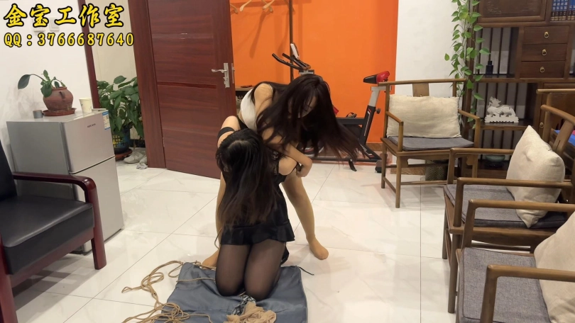 依依趁小月离开解开了束缚,并将小月反杀,丝袜堵嘴。依依以彼之道还施彼身,牵着小月在屋里走,将小月折腿缚之后也是对小月上下其手,还用自己的丝足挑逗小月。