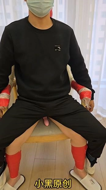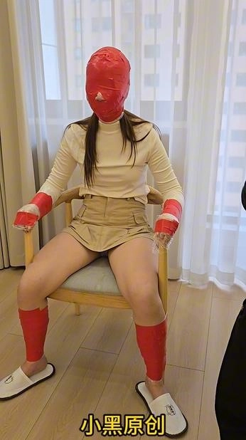 【小黑】胶带椅子拘束逃脱挑战,胶带全包头,保鲜膜再缠上,她疯狂挣扎,我依然不给她解开,最后惩罚是打开门给她放门口。