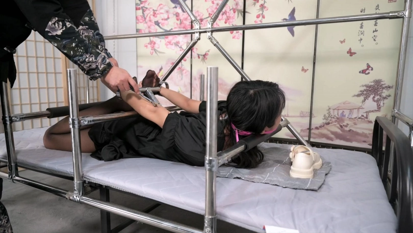 这是梦想之床的又一金属固定用法,受刑者为沐小雨,由于她竟然拒绝使用电击道具,那本主只好把刺激最大的道具都用上了,先把她固定好放置一段时间是前戏,然后是沐小雨比较怕的挠痒TK,再然后是皮鞭和TK的结合,本片皮鞭那段第一次没有按拍摄按钮,片中已经是第二顿皮鞭伺候,当然还有刺轮洗礼,最后的大菜是滴蜡,直到她精疲力竭才解我心头之愤闷。本片脱下沐小雨鞋子的时候,突发灵感让她闻自己的臭鞋,她竟然嫌弃自己的味道,还屏住呼吸,聪明的我马上给她挠痒,让她不得不深呼吸一下捂在嘴上的公主鞋,然后干脆就把鞋放在她嘴边,让她一直闻着!