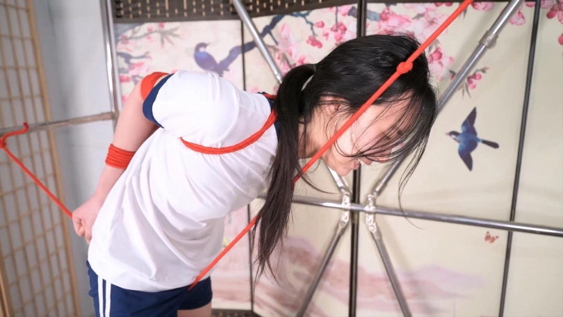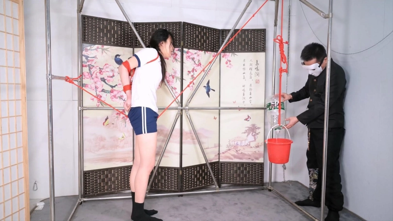 如果说上半段的走绳惩罚,把不服不忿的小丫头治得求饶,让人觉着心理很愉悦,那接下来的吊桶惩罚,就渐渐开始让人心疼了,妹子换上运动短裤,随着桶里不断加水,妹子的压力越来越大,期间还用了戒尺、TK和电击,使她身体不断挪动,股绳用的是一条棉绳,张力会越来越大,眼看着已深深嵌入,妹子的表情也越发痛苦,她的脚趾不住的扣地,这次真见识到啥叫脚趾扣地了,最后她实在受不住求饶的时候,声音也多了几分凄厉!
