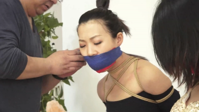倒霉的林艺也跟韩经洁一样,上身被劫匪五花大绑后,穿着黑色连裤丝袜的双腿和脚踝也被抓住并拢捆绑结实,嘴里带着塞口球。