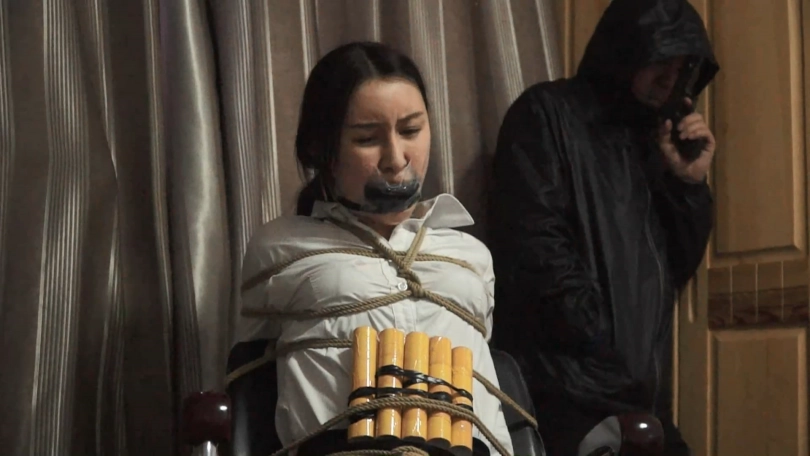 女卧底被捆绑在椅子上绑上爆单,被用枪顶住脑袋,门外传来队长的声音,队长打开门一边说道:“小刘,我们来救你了,你别怕”