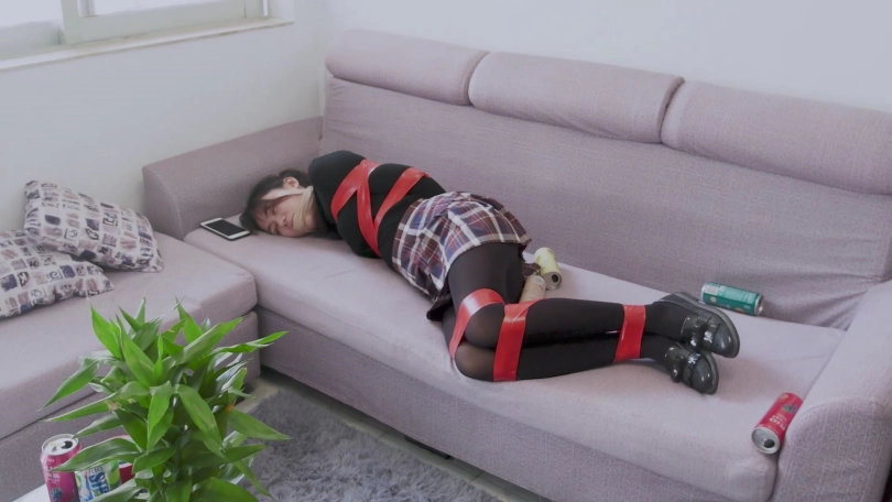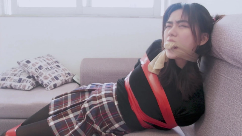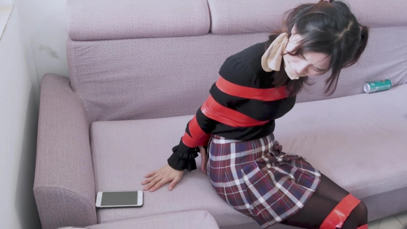 文莉找来一个胶带,把冬冬的手脚都用胶带给捆绑起来,然后拿起沙发上不知是自己的还是冬冬的一团丝袜塞