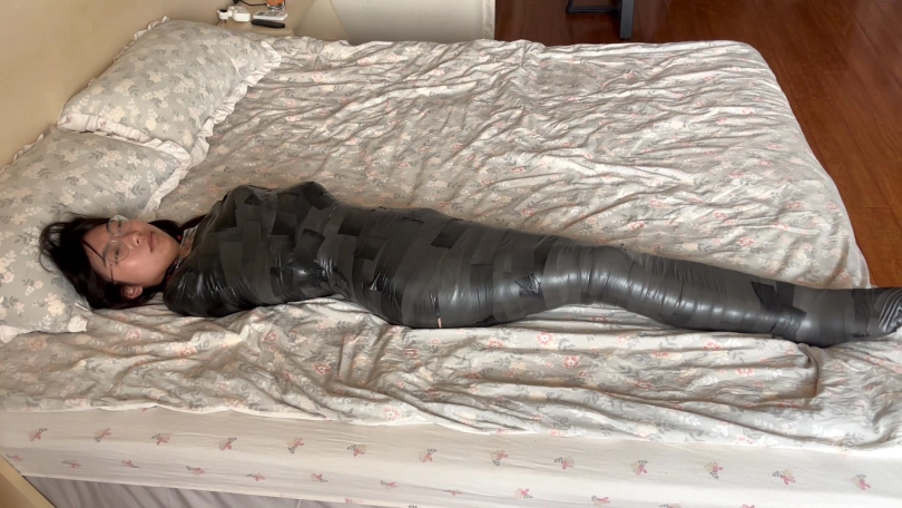 女侠努力舞动着双手:该死,双手被包裹成球了没法用手解缚呀,而且缠绕的好紧,双拳摩擦不开呀。