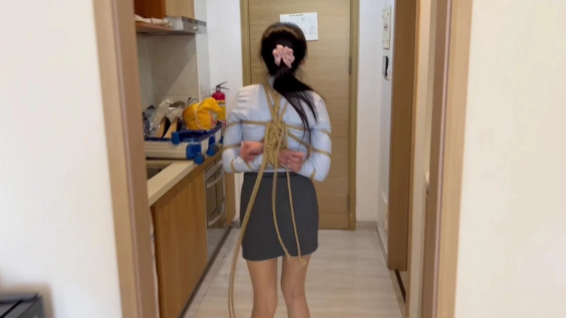 Cici还不屈服,不断抬踢腿踢小伙伴,邪恶小伙伴再拿出绳子,将她驷马捆起来,然后口球旁边放个杯子,收集Cici滴下来的口水。并取笑说:“等口水满了就放了你啊。”