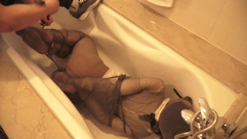 神秘人把小涵抱进旁边的浴缸,解开小涵的勒嘴,为她带上马式口球,用灰色丝袜套头。再解开双脚处的胶带和绳子,将双脚交叉重新绑好。脱掉小涵的短裙,用丝袜包住她的双腿和双臂,再用丝袜驷马捆绑起来。