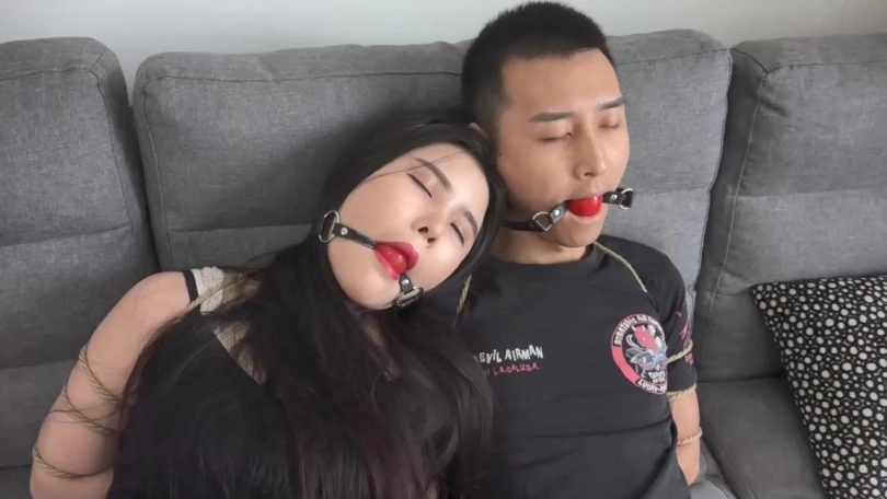年轻美女孙甜从昏迷中醒来,发现自己和丈夫被五花大绑,嘴里带着口球坐在沙发上。