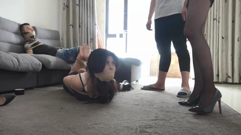 晓萌与男友得意的离开,孙甜与丈夫剧烈挣扎呜呜闷哼着,经过一番苦苦挣扎,孙甜终于弄松捆绳,给老公松绑,二人撕掉封嘴绷带胶带,拽出口中湿润的原味脏袜子,大口喘息着,琢磨着对晓萌和晓萌男友的报复。