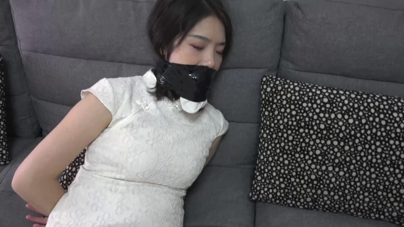 旗袍美女晓璐从昏迷中醒来,发现自己双手反绑,脚踝也被并拢捆绑着。