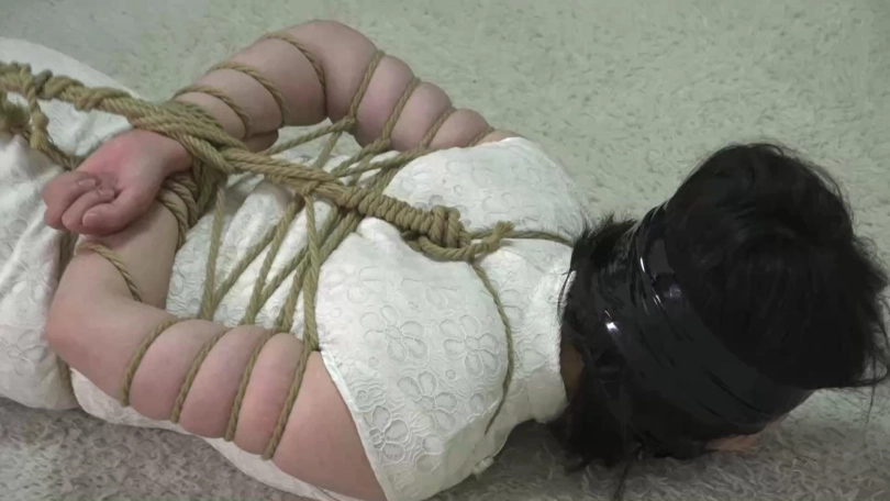 看点:逃脱未遂、严厉五花大绑+驷马、肉色连裤丝袜+一双短丝袜塞嘴、胶布绷带缠绕封嘴、胶布封眼、裸足脚面特写。