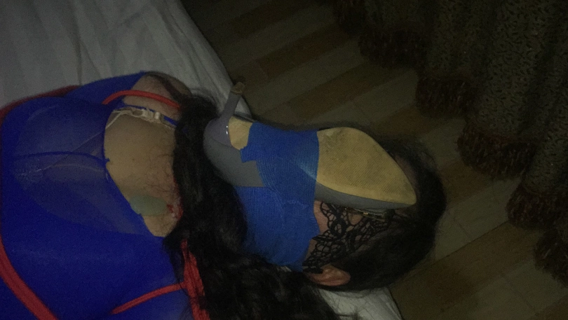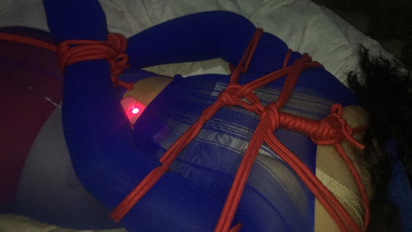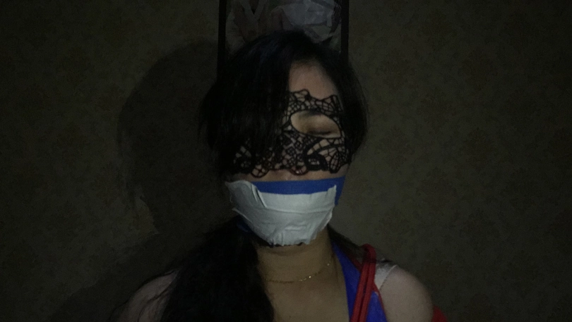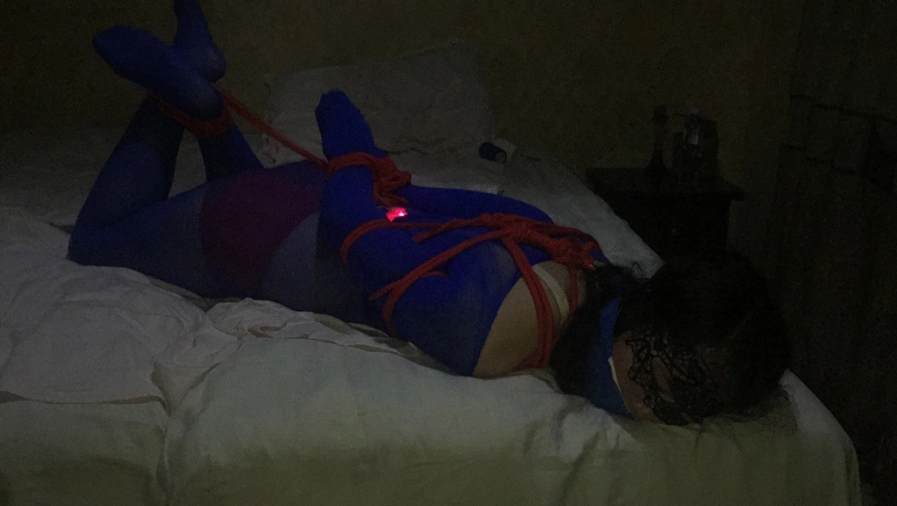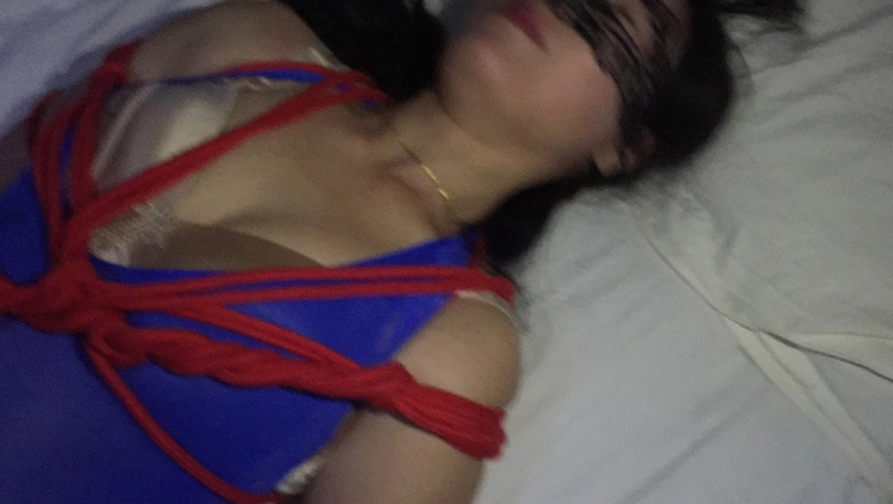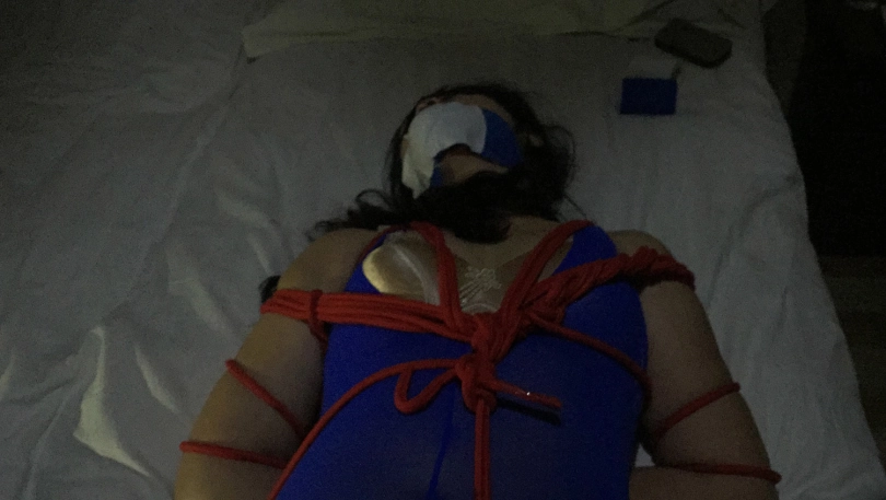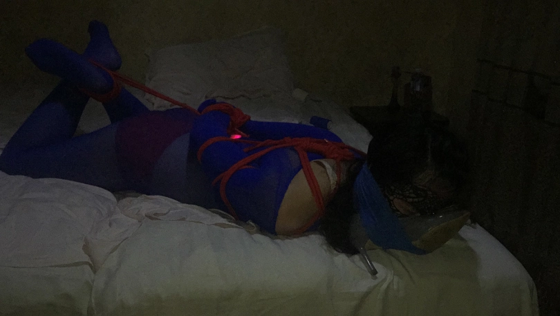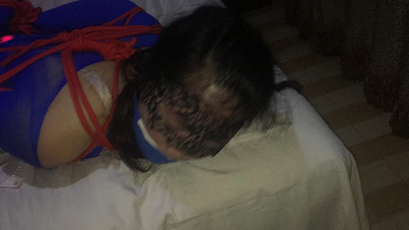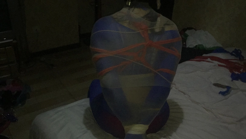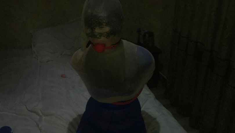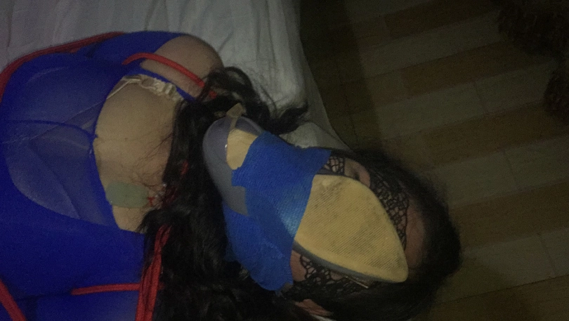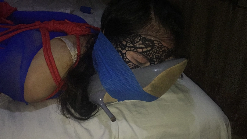 穿上蓝色裤袜连体衣,驷马捆绑,丝袜全包,嘴里塞进丝袜,外面用绷带封住,强制闻自己的高跟鞋,TD塞入,震动B刺激。嘴上说不要,但身体却很诚实的抽搐扭动起来并渐渐的变成呻吟声。。。