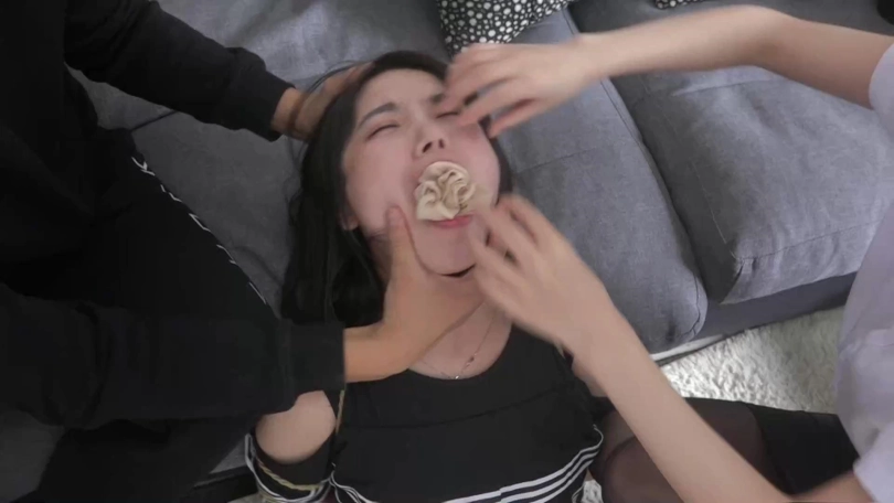 两名劫匪将晓璐五花大绑,脱掉晓璐脚上穿的一双原味肉色短丝袜,强行塞入晓璐口中,女劫匪更是脱下腿上穿的一条黑色连裤丝袜,把裆部塞进晓璐嘴里,两个袜腿缠绕打结勒住晓璐的嘴。