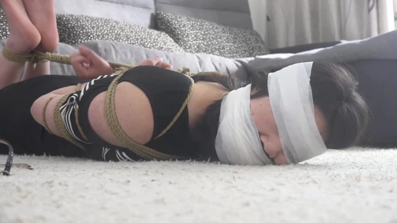 晓璐趁二人翻找财物之际,拼命扭动身体挣扎,并试图朝大门处移动,不幸被两名劫匪发现,惨遭加固捆绑。