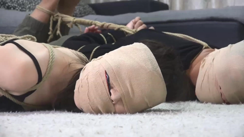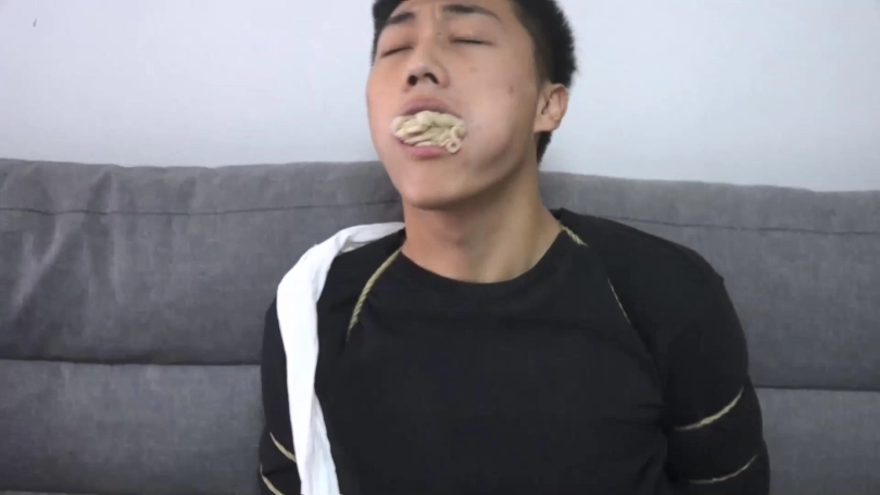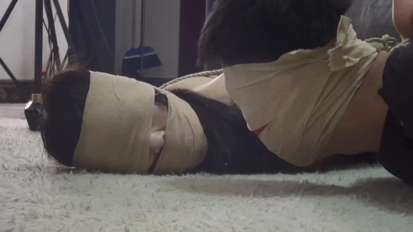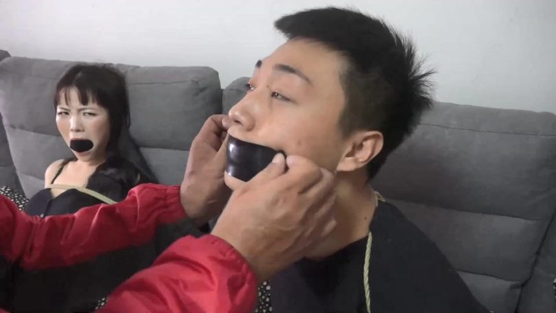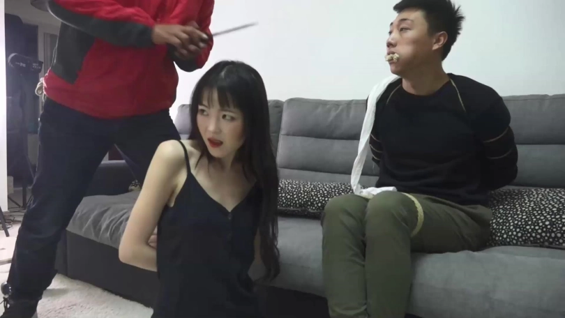 美女文冰兴高采烈下班回家,却看到老公被五花大绑,坐在沙发上挣扎,嘴巴也被白色布条勒住。
