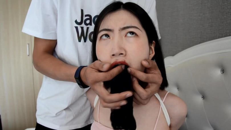美女小鱼遭遇劫匪入室抢劫,劫匪抢去小鱼的财物后,把小鱼用白色绳索捆成类似欧式直臂的姿势,还拿小鱼穿过没洗的一条紫色内裤和一条黑色内裤塞满小鱼的嘴巴,塞得小鱼表情痛苦直翻白眼。