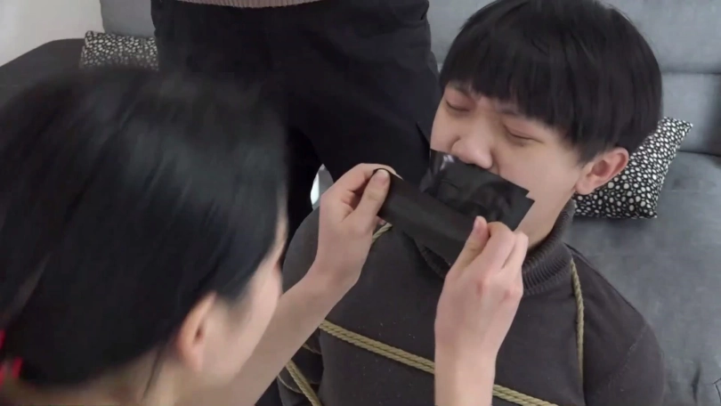 片段6:与男友一起上门讨债的大胸美女李沐子被坏女人文清及其表哥捆绑,二次塞嘴封嘴折磨。